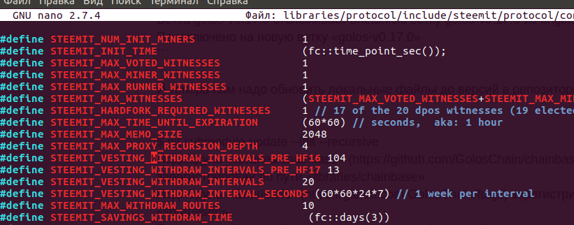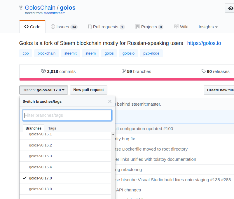 Как видно на скриншоте, есть branch под названием golos-v0.17.0. Вот на нее нам и надо переключиться. Для этого в корне папки с исходниками выполним следующую команду