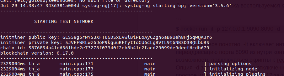 Собственно все понятно. -it включает интерактивность. “-p 127.0.0.1:9090:8090” включает переадресацию порта 8090 изнутри контейнера наружу, на порт 9090. Это дает возможность подключаться скриптами к тестнету используя URL вида ws://localhost:9090. Опция -d запускает контейнер отключенным от консоли в фоне. --name testnet задет простое имя контейнеру. -t testnet-17 задает имя образа, который будет использоваться для создания контейнера.